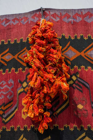 Bundles of red peppers dry in the sun