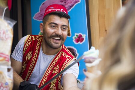 ISTANBUL, TURKEY - JUNE 15, 2019: Unidentified seller of Turkish ice cream at Istanbul, Turkey. Traditional Turkish ice cream was made with salep, produced by orchid flowers.