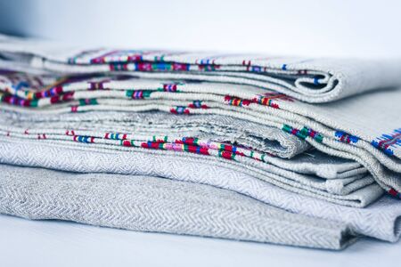 A stack of woven linen towels with embroidery, traditional handmade in Ukraine