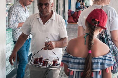 Bodrum, Turkey - August 23, 2019. A strict elderly Turkish man delivers hot fresh tea at the market of the city of Bodrum in Turkey.