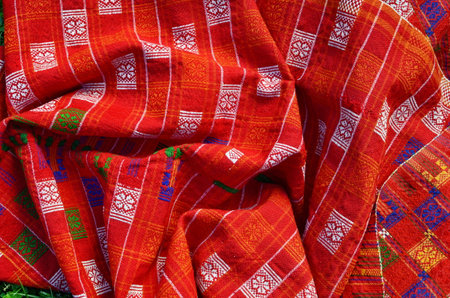 Vendor stall selling colorful handmade fabric in Sunday marhet in Bac Ha near Lao Cai Sapa north of Vietnam