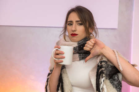 Sick woman with hot cup of tea in warm plaid. Illness and medicine concept