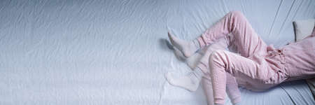 Cold medicine and sick woman drinking hot beverage to get well from flu, fever and virus. Dirty paper towels and tissues on table. Ill person wearing warm woolen stocking socks in winter.
