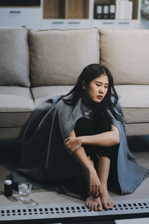 sick woman sitting at home cold treatment health problems