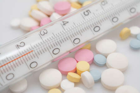 medical thermometer and color pills close up on white background, COVID-19 coronavirus infection concept horizontal shot