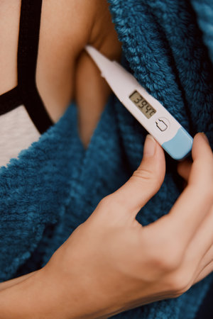 Sick ill woman with digital thermometer in mouth. Young girl having high fever measuring temperature. Health.