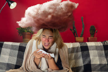 Ill young girl with fever and cold looks suffering. Feeling sick, blue, snuffling. Big cloud above the head like weight during feeling ill. Cold, virus, seasonal grippe. Woman sitting on sofa at home.