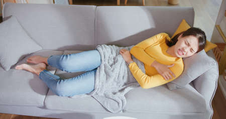 Tired ill woman lying on sofa and covering her eyes