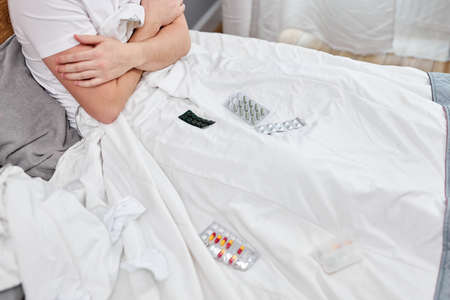 ill man sitting on bed having high fever, surrounded by medications pills vitamins, at home alone. coronavirus, covid-19 concept