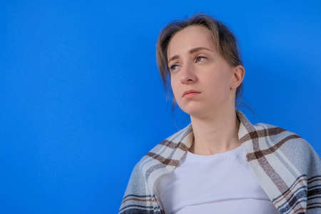 Portrait of pensive woman in plaid blanket feeling sick, looking away in room with blue wall at home. Healthcare, copyspace, disease, covid19, infection, coronavirus concept