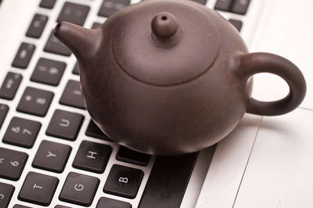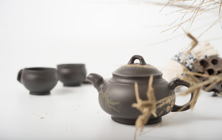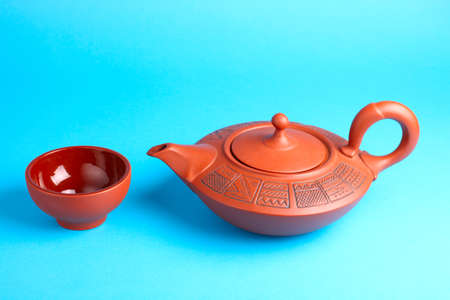 Tea concept with clay tea set, cup and teapot close up. Asian traditional tea culture.