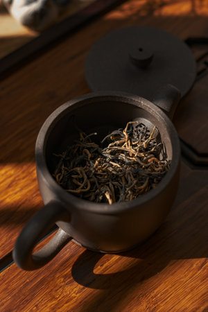 A Beautiful Teapot Displaying Dry Tea Leaves Captured in Natural Light for Your Enjoyment