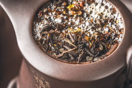 Traditional Teapot from Yixing clay for Chinese tea ceremony on rustic wooden background Close up image