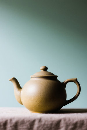 A serene still life featuring a traditional clay teapot and a blue bowl of tea on a textured surface, creating a cozy and inviting atmosphere.