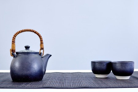 Tableware for tea ceremony . Blue tea set pottery on bamboo napkin