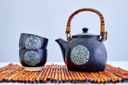 Traditional tea ceremony accessories, teapot and teacup with wooden background