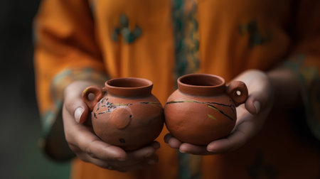 The warmth of a cultural ritual captured as hot tea flows from a decorative kettle into earthen cups.