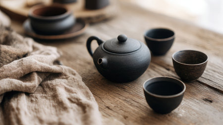 Minimalist tea ceremony setup with clay teapot, cups, and linen on a wooden table