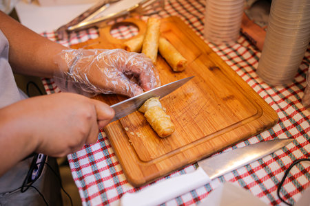 Cutting Otak-Otak Lumpia on a chopping board using a knife
