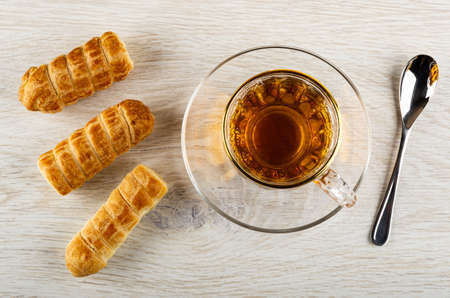 Puff rolls with creamy filling, transparent cup with tea on saucer, teaspoon on wooden table. Top view