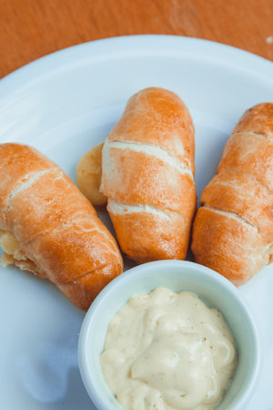 Asian street food sausage bread. On wooden floor, in white plate.
