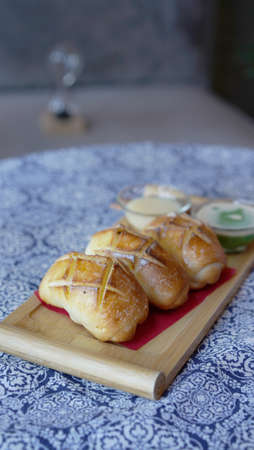 Fried mantou, chinese flour bun with condensed milk and cream dipping. Traditional cantanese snack on plate.
