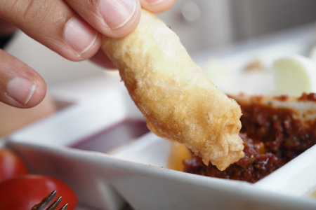 Smearing spring roll in sweet and sour sauce.Eating chinese food at home.Focus selective.