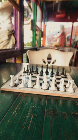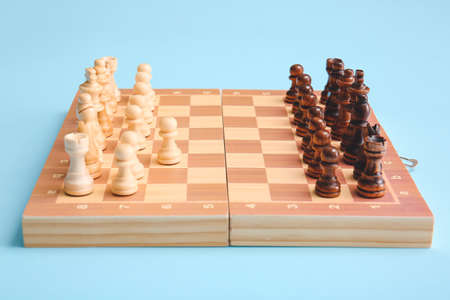 Traditional chessboard with wooden pieces. POV from one side facing the other just before the match. Battle or teamwork concept.