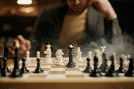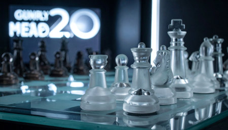 A captivating image of colorful chess pieces set against a smoky backdrop, showcasing a dramatic interplay of light and reflection that emphasizes strategic gameplay.