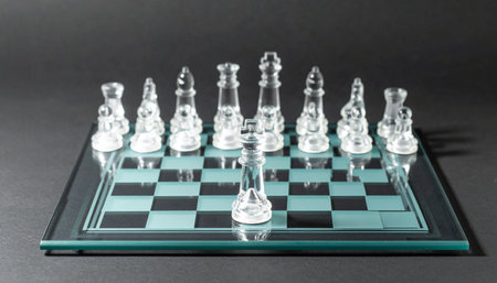 A stunning glass chess set gleams against a dark, dramatic background. The pieces are arranged, ready for a battle of wits, with a single pawn bravely stepping forward to initiate the game.