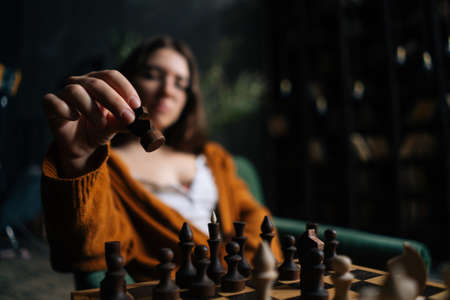 Selective focus of cute businesswoman in elegant eyeglasses making chess move sitting on armchair in dark room, on background of bookcase. Pretty intelligent lady playing logical game alone at home.