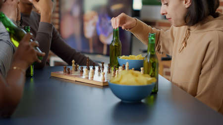 Focused woman playing strategic board games with friends, having fun with chess match and competition at home. Happy people enjoying gameplay together, serving beer. Handheld shot. Close up.