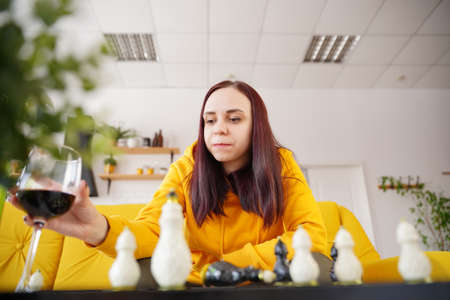 Young woman playing chess and drinking red wine in room. Adult female with alcohol plays in logical board game with herself, sitting on sofa