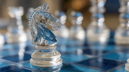 A crystal knight chess piece stands tall on the board surrounded by clear and blue pieces creating a captivating scene.