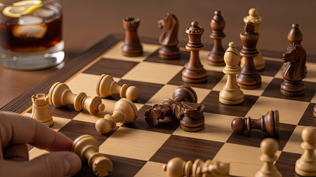 On a rustic wooden chessboard, pieces stand poised for battle, bathed in the warm, dramatic light of a low sun.