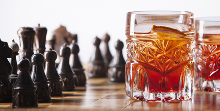 Whiskey with lemon in old-fashioned glass mug on a chess board, selective focus