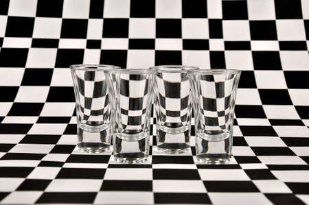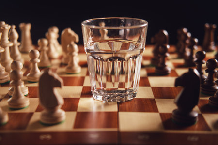 Glass of clean water on a chess board. Concept of strategy, clear thinking, and important hydration during a game. For health and sport.