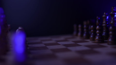 Chess pieces on a stone table. cinematic light. Intellectual game background.