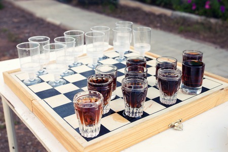 Chess-board and chess pieces, a goblet of wine and a glass of whiskey on a transparent table