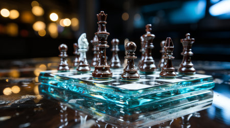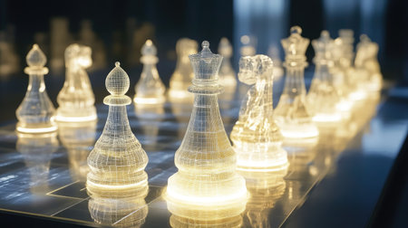 This captivating image features illuminated transparent chess pieces arranged on a glass board. The futuristic design and soft lighting create an intriguing atmosphere, emphasizing strategy and intellect.