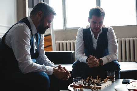 Two young handsome men in full suits playing chess and smiling while sitting indoors.