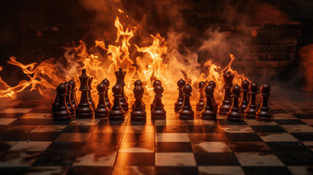 Chess in fire. business strategy brainstorm chess board game with hand touch black background with free copy space for your text.