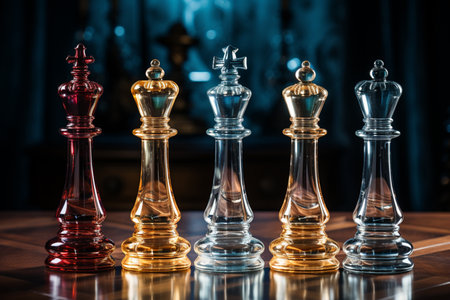 This image showcases a close-up of translucent chess pieces arranged on a chessboard. The pieces display iridescent effects, with shifting colors. The composition is likely illuminated by soft lighting. The image may be suitable for illustrating strategy, competition, or conceptual design in commercial or editorial contexts.