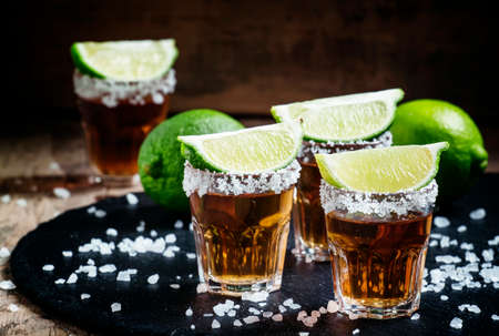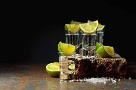 Tequila shots with lime and salt on a rustic background. Copy space.