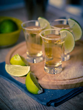 Tequila shots with salt and lime, selective focus and toned image