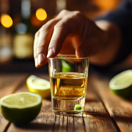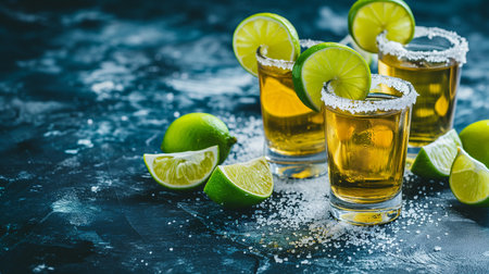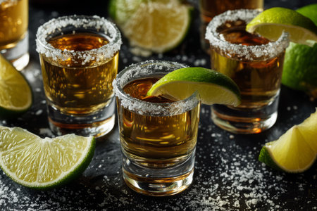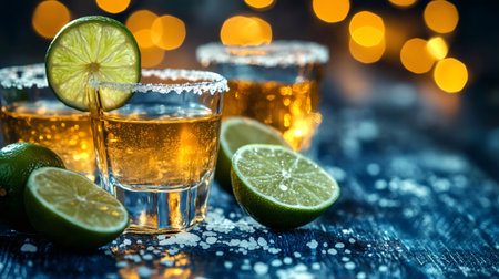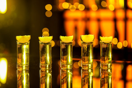 Gold tequila shots with lime slices and salt on wooden table with nice bokeh effect in the background, celebrating a special occasion