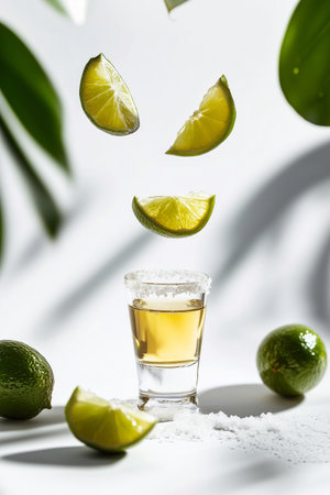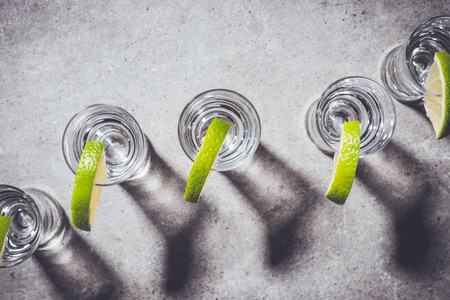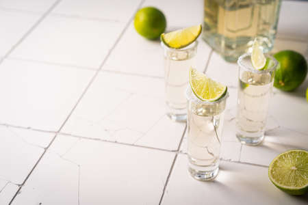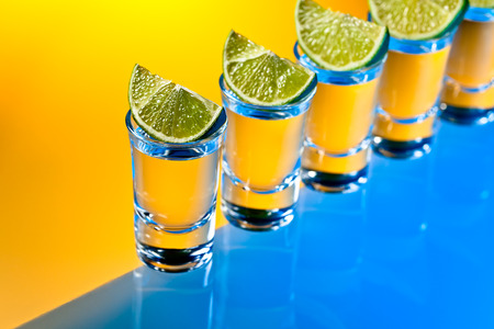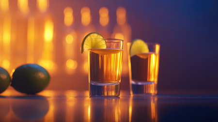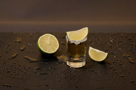 Mexican Tequila shots with lime slices on bar counter