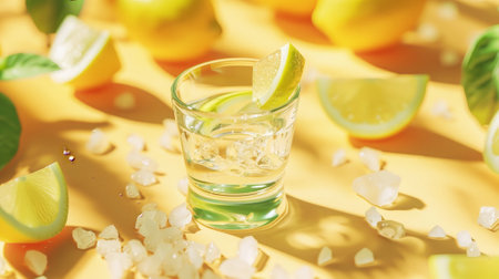 Shot glass of tequila with lemon and salt on a yellow background. Advertising concept. Party concept. Generative AI.