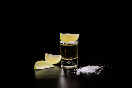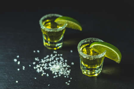 Mexican Gold Tequila shot with lime and salt on black stone table surface, selective focus, shallow depth of the field, copy space.