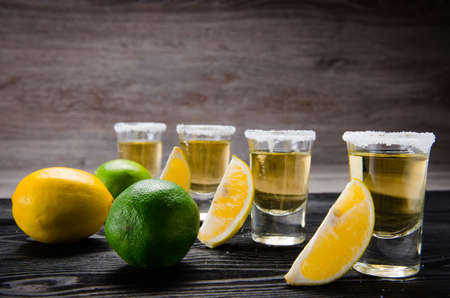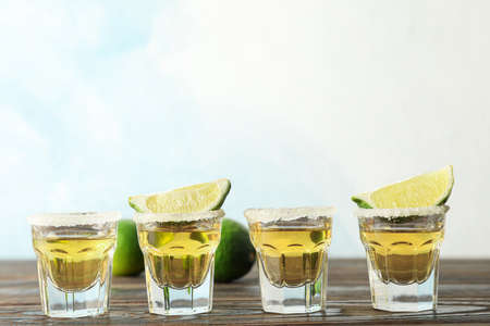 Shots of tequila on wooden background